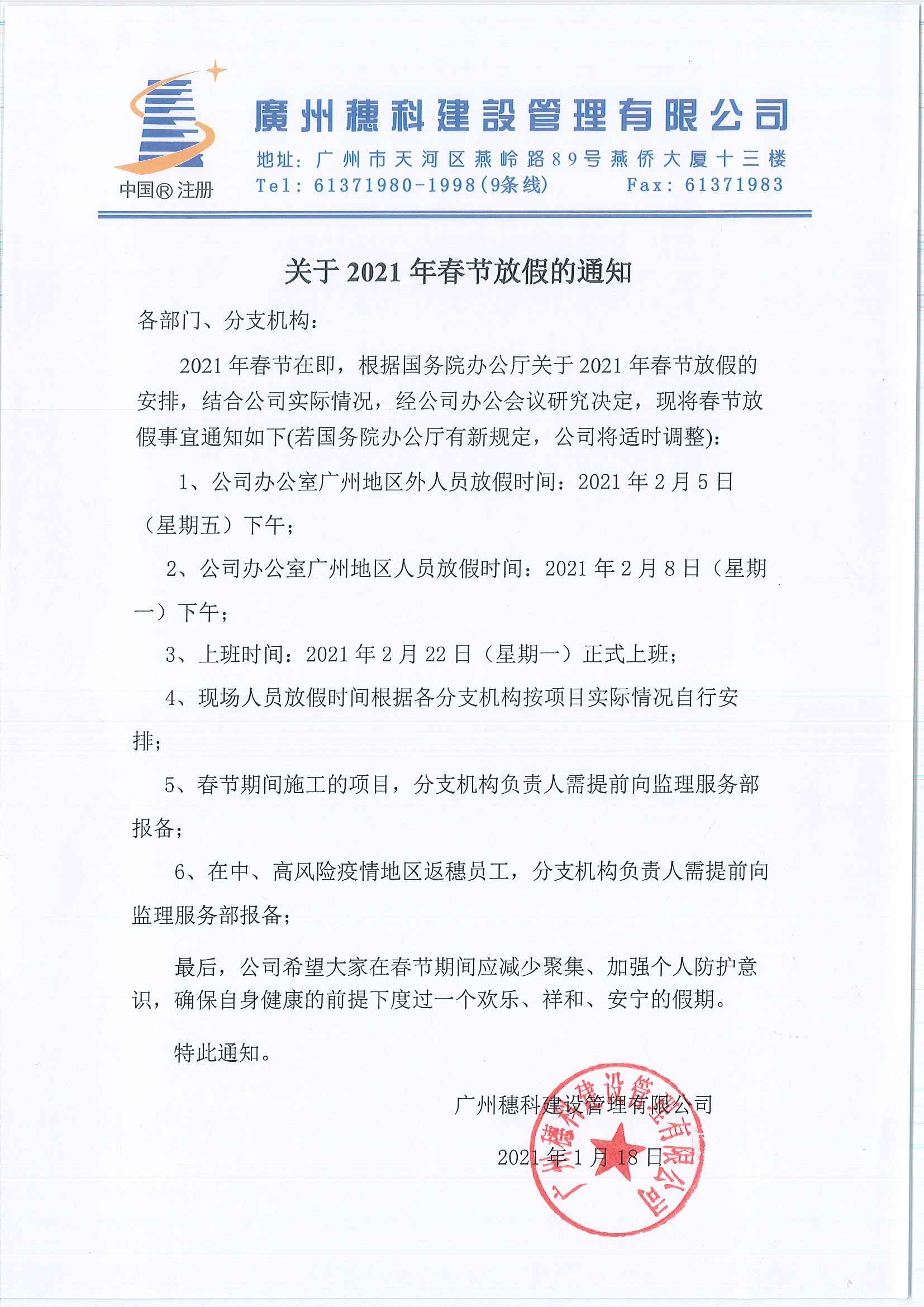关于2021年春节放假的通知