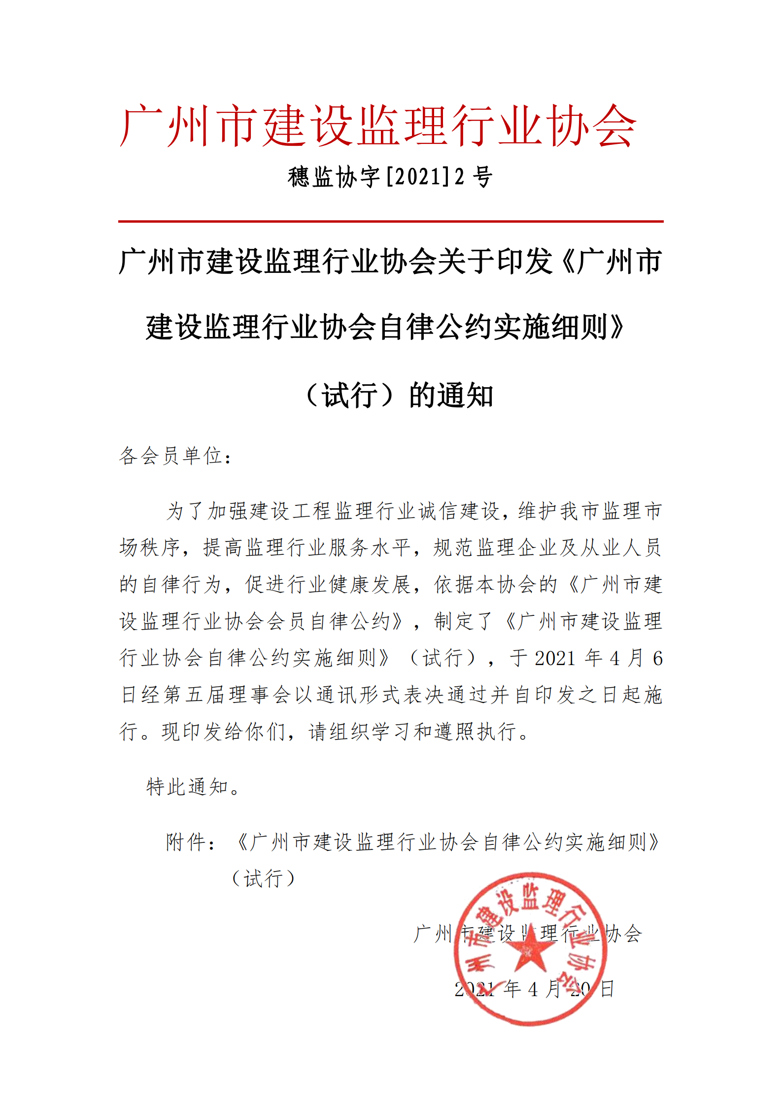 现将《广州市建设监理行业协会关于印发《广州市广州市建设监理行业协会自律公约实施细则》(试行)的通知》转发给你们,请遵照执行。
