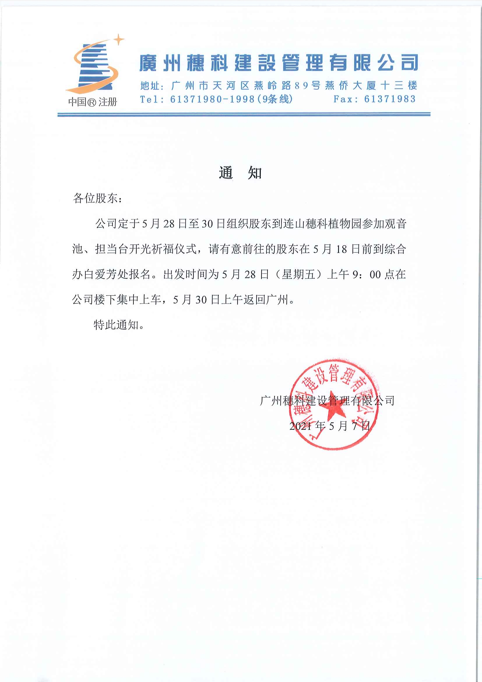 关于组织股东到连山穗科植物园参加观音池、担当台开光祈福仪式的通知