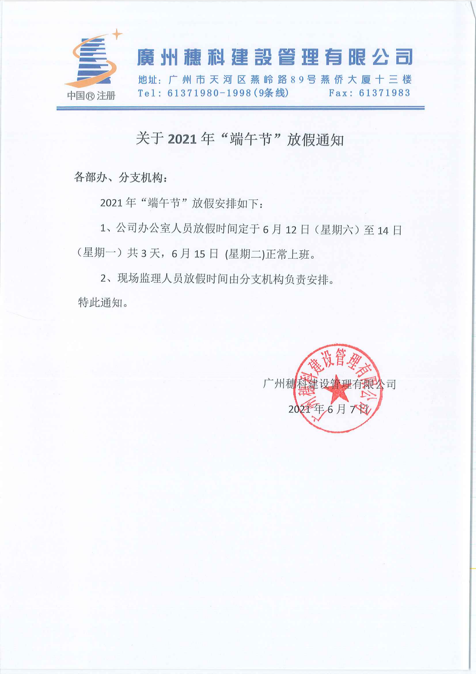 关于2021年“端午节”放假的通知