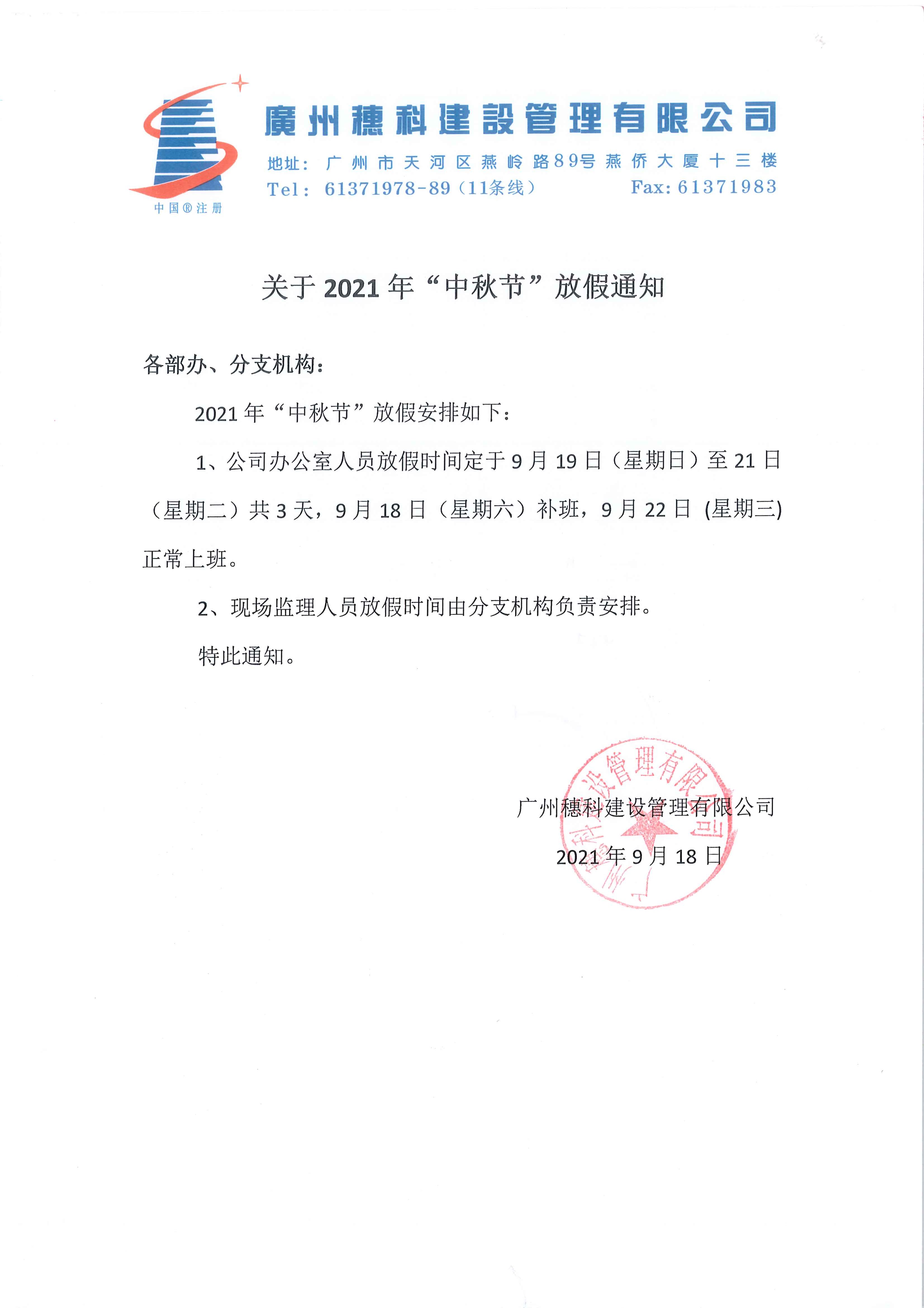 关于2021年中秋节放假的通知