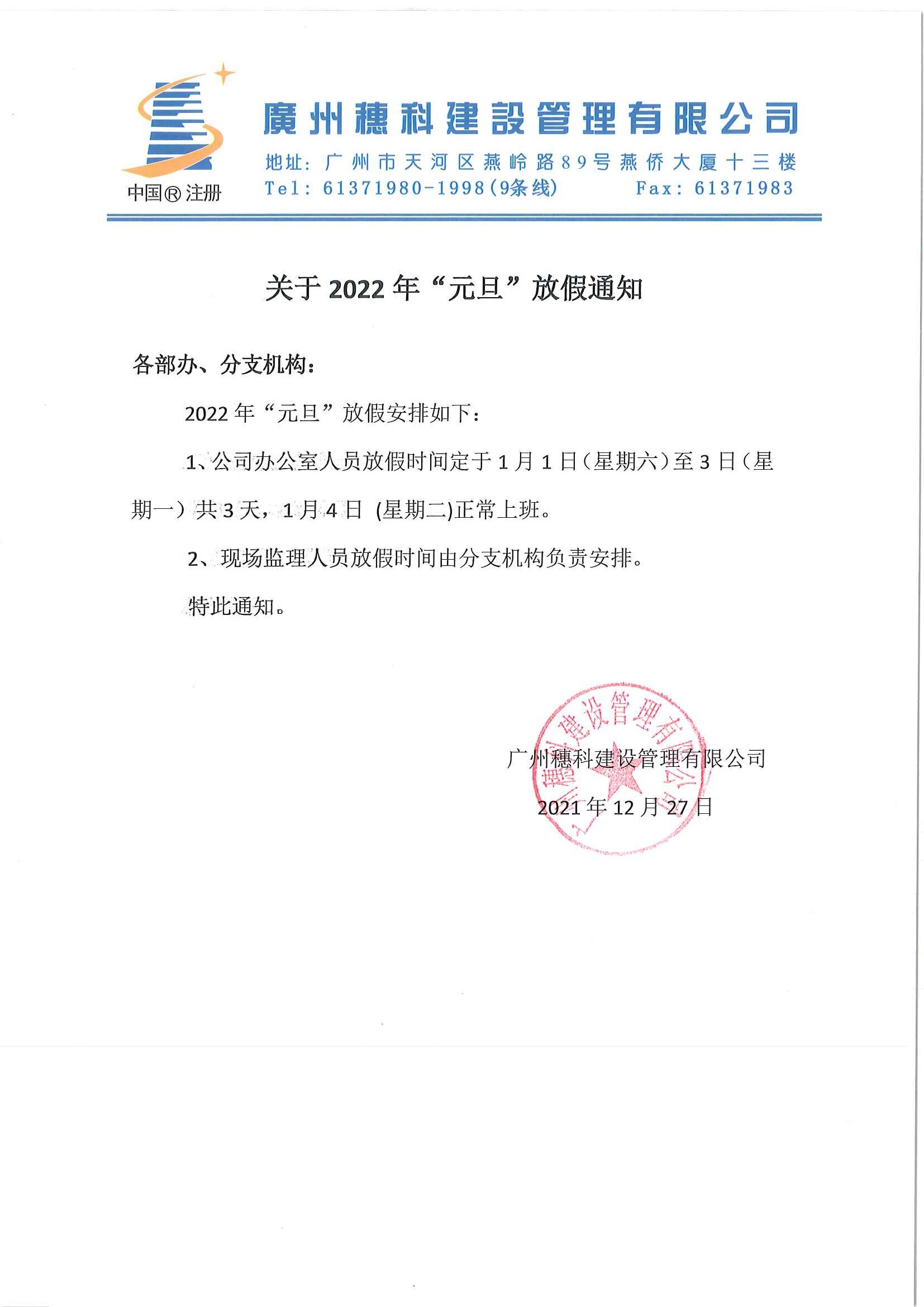 关于2022年“元旦”放假通知
