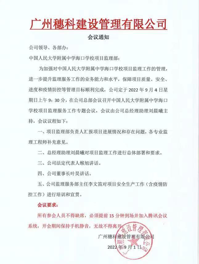 关于召开中国人民大学附属中学海口学校项目监理服务工作专题会议通知
