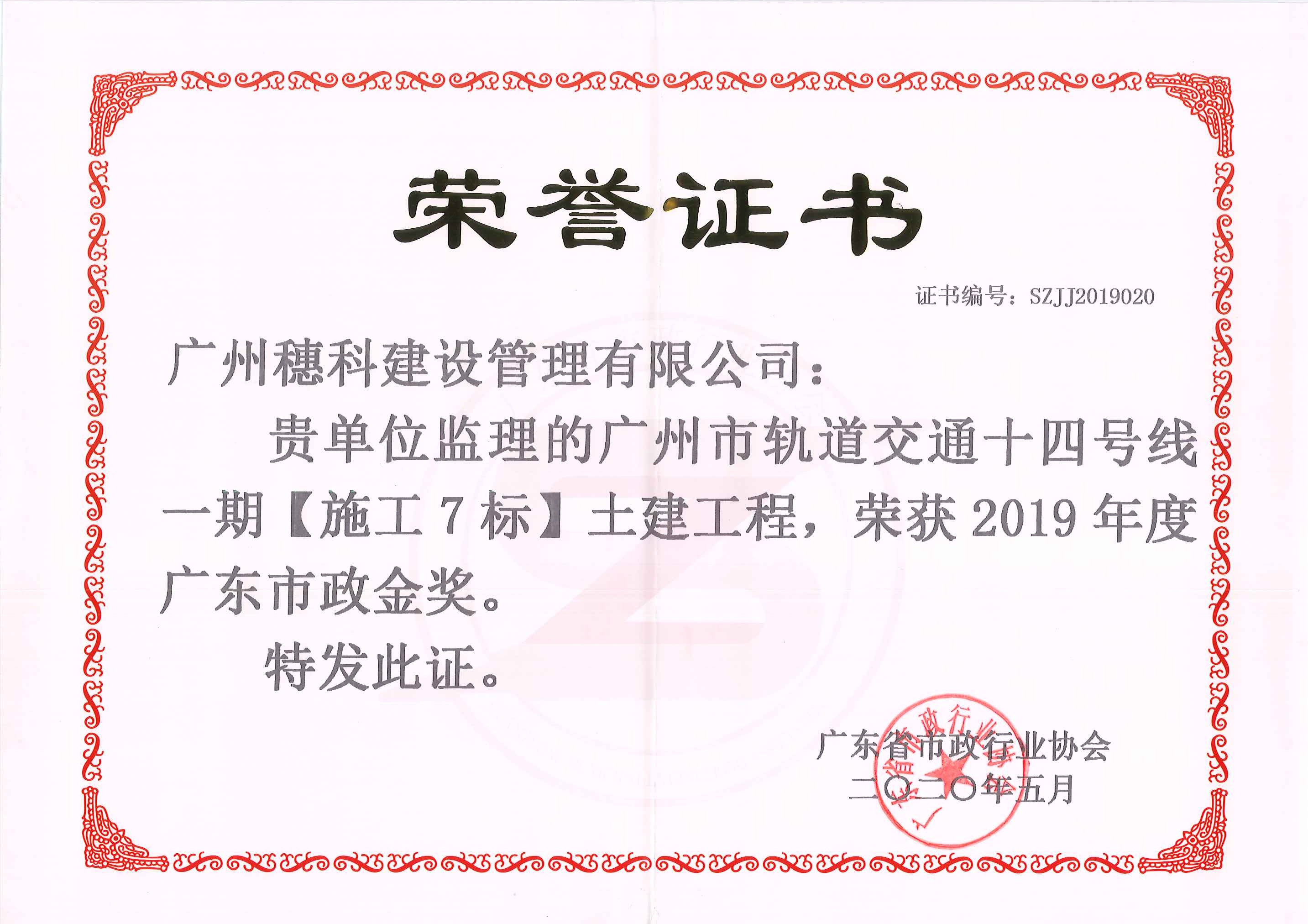 热烈祝贺我司监理的广州市轨道交通十四号线一期【施工7标】土建工程,荣获2019年度广东市政金奖。