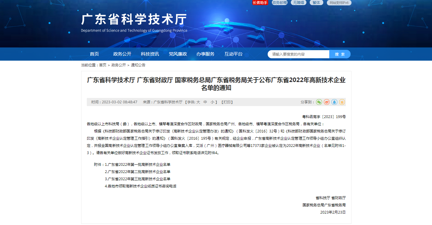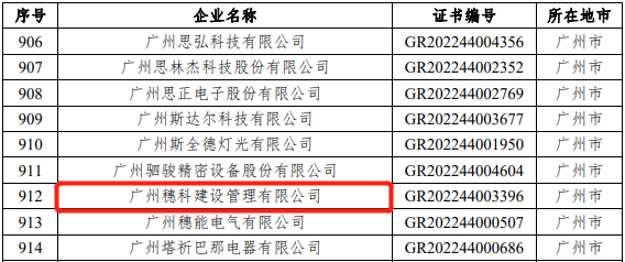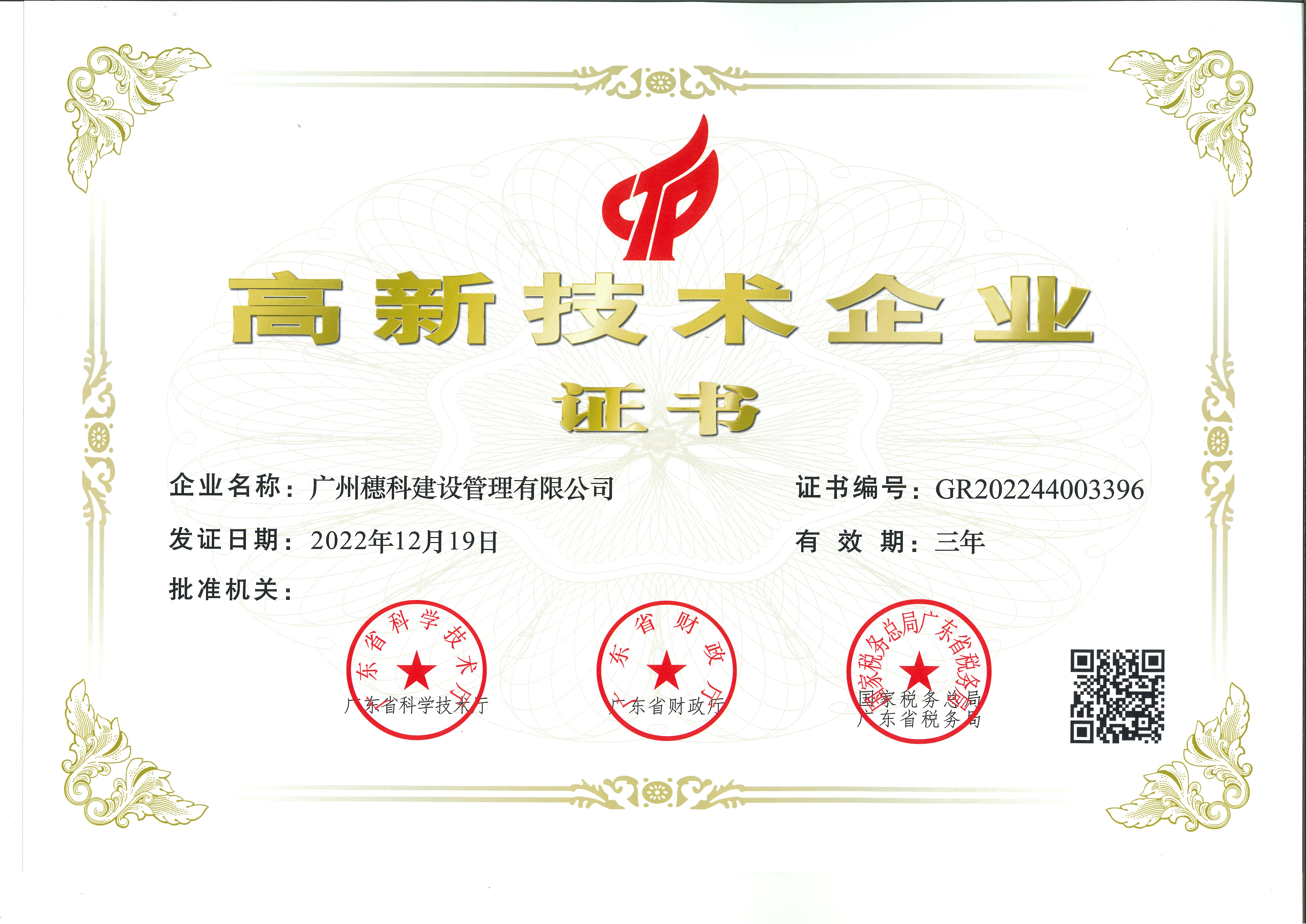 2023年2月23日,广东省科学技术厅、广东省财政厅、国家税务总局广东省税务局发布《关于公布广东省2022年高新技术企业名单的通知》,广州穗科建设管理有限公司(以下简称“穗科建管”)顺利通过2022年高新技术企业认定,这是穗科建管第二次荣获高新技术企业称号!