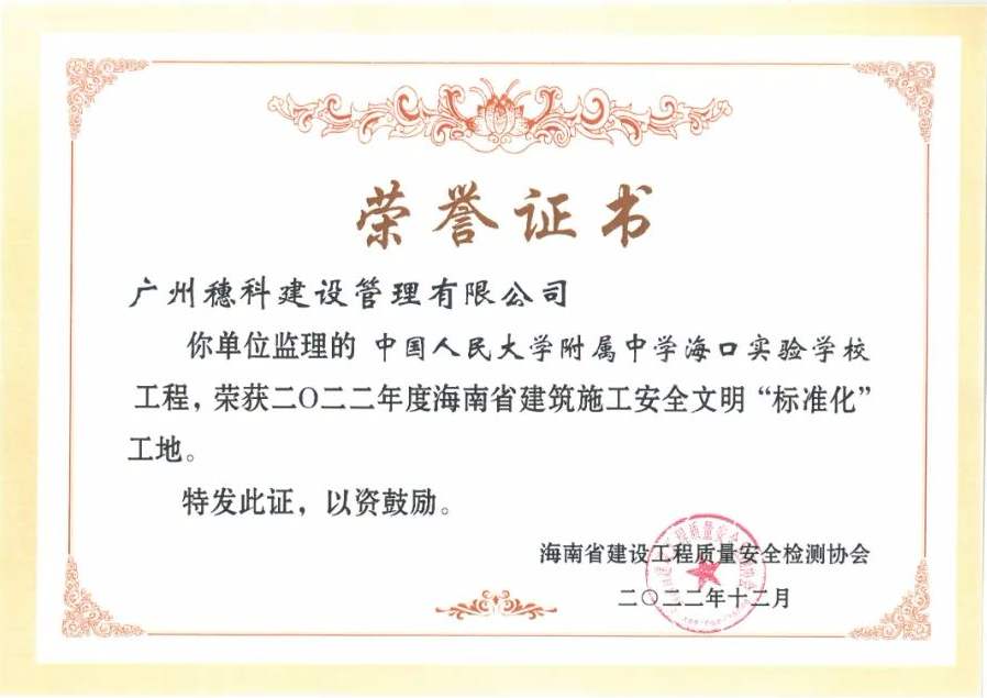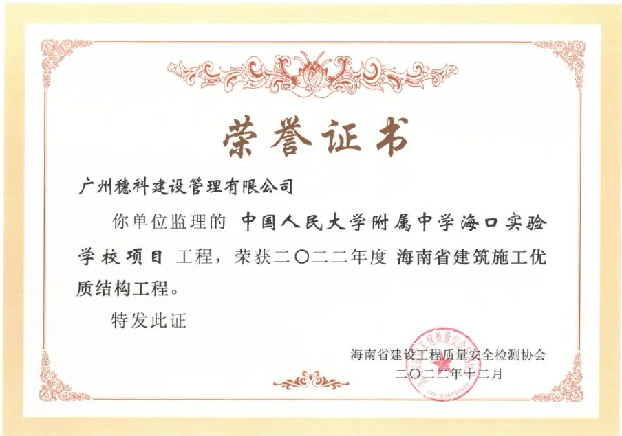 近期,海南省建设工程质量安全检测协会公布多个奖项获奖名单。我司监理的中国人民大学附属中学海口实验学校项目荣获2022年度海南省建筑施工优质结构工程和2022年度海南省建筑施工安全文明“标准化”工地两大奖项。