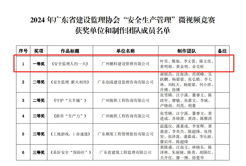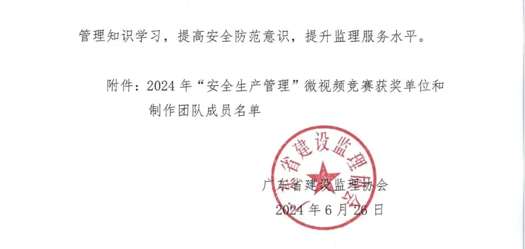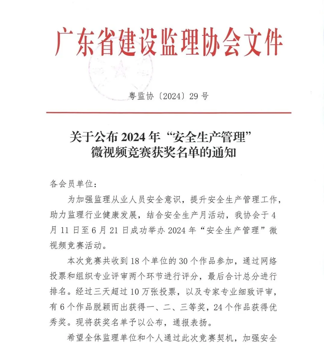 我司参加广东省建设监理协会举办的2024年“安全生产管理”微视频竞赛荣获一等奖