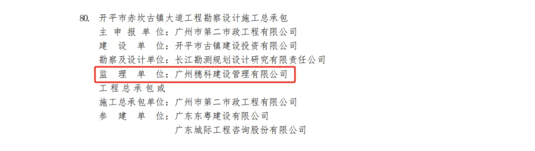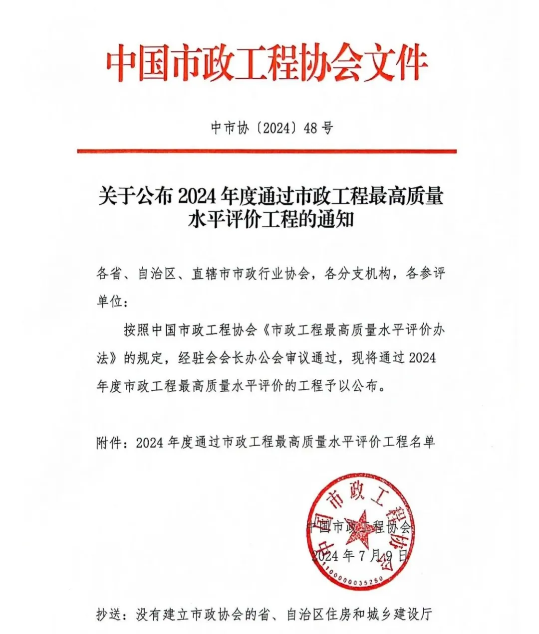 近日,中国市政工程协会发布了2024年度通过市政工程最高质量水平评价工程名单。我司监理的开平市赤坎古镇大道工程勘察设计施工总承包项目荣获“中国市政工程最高质量评价”称号,市政工程最高质量水平评价是市政工程行业在工程质量方面最高的质量水平评价,代表市政工程行业同时期国内先进水平,在行业内具有重要的示范引领作用。
