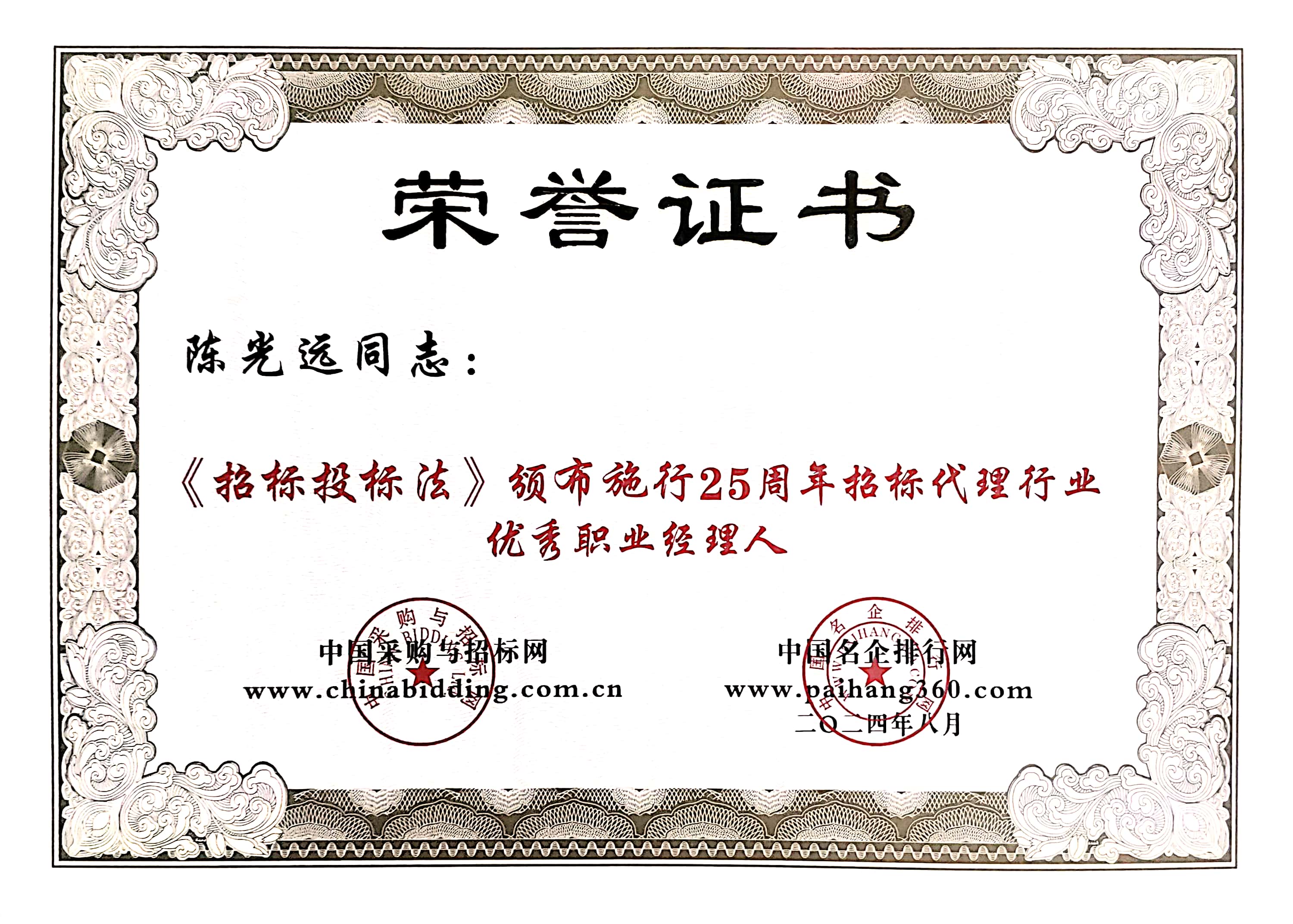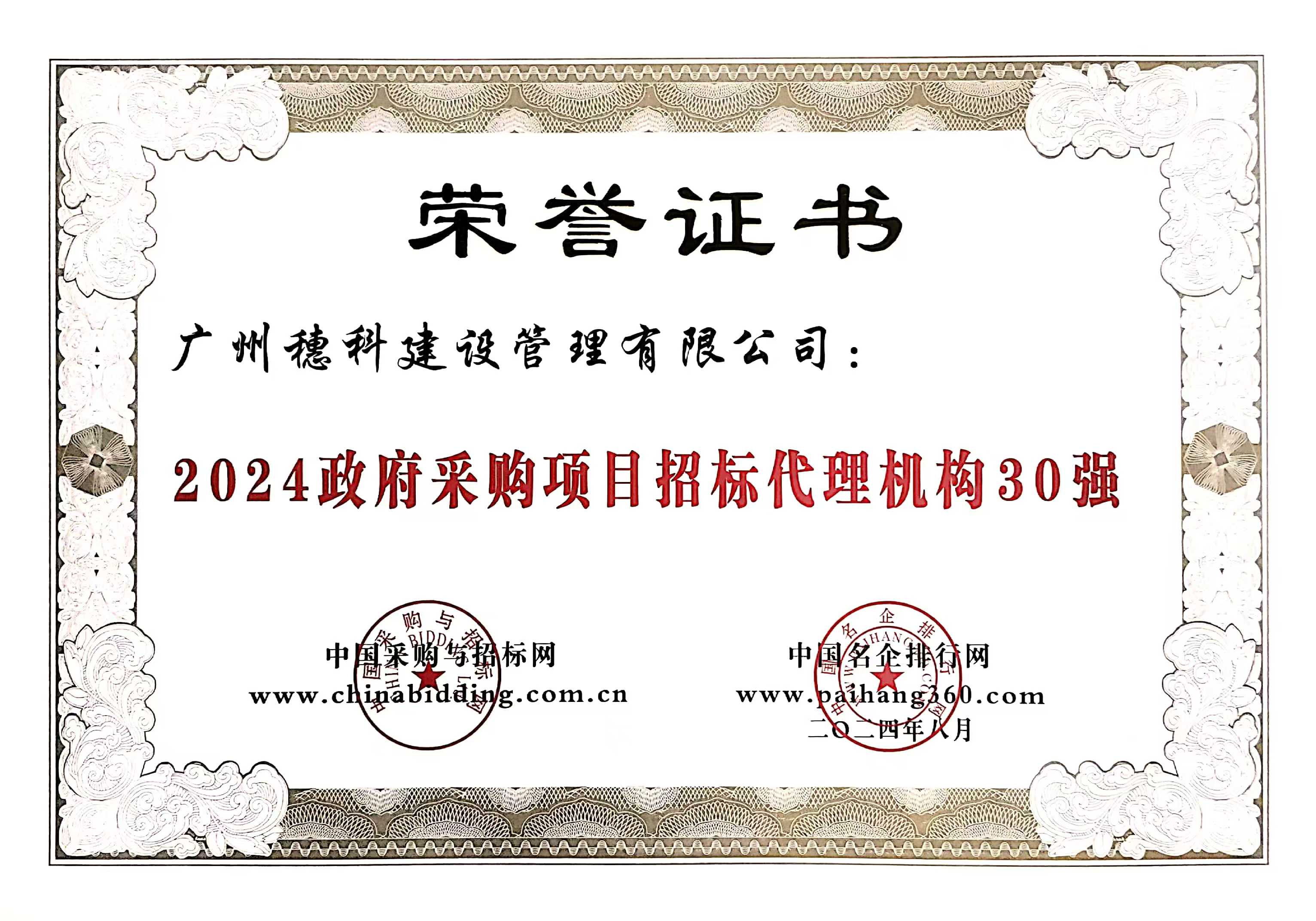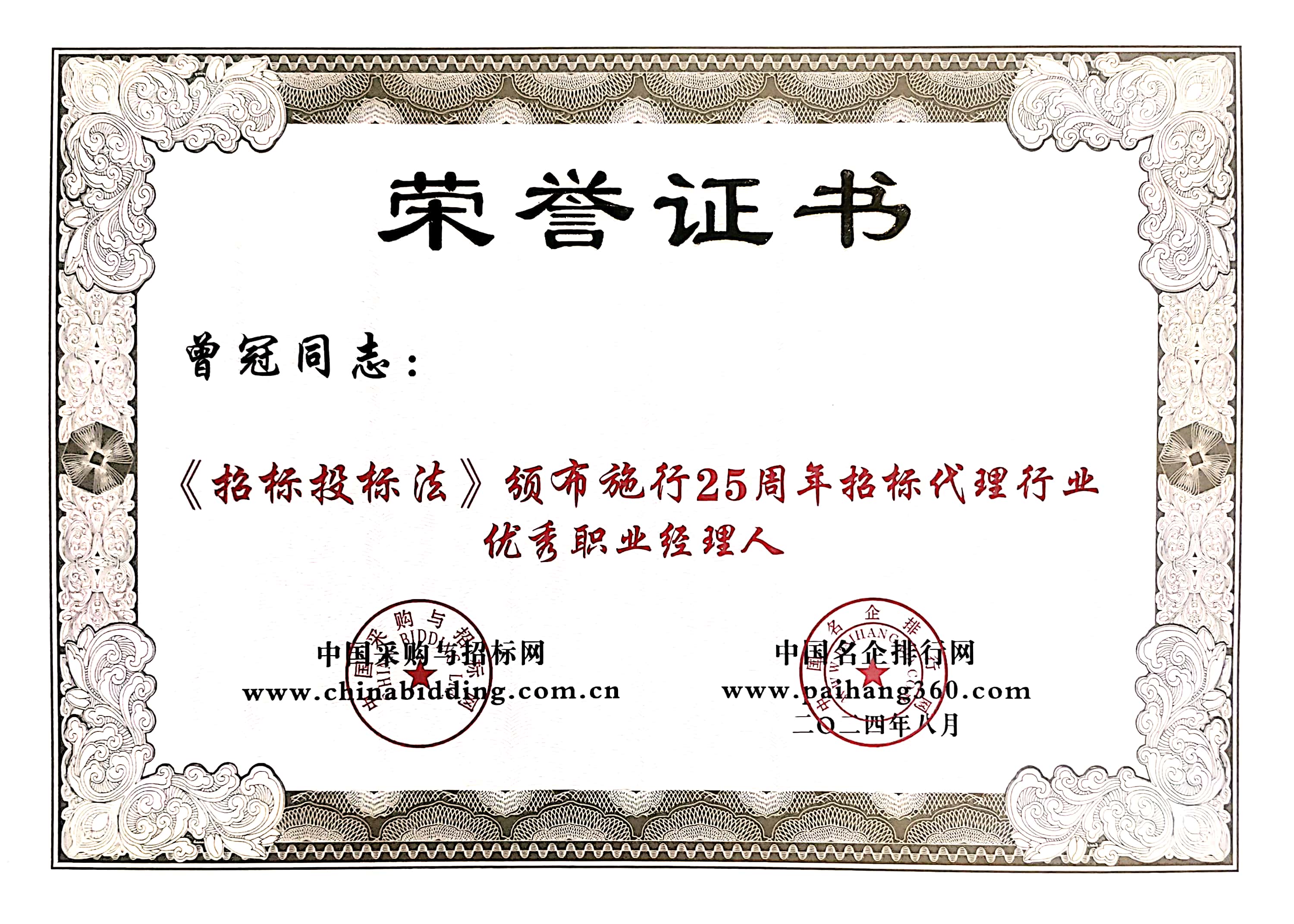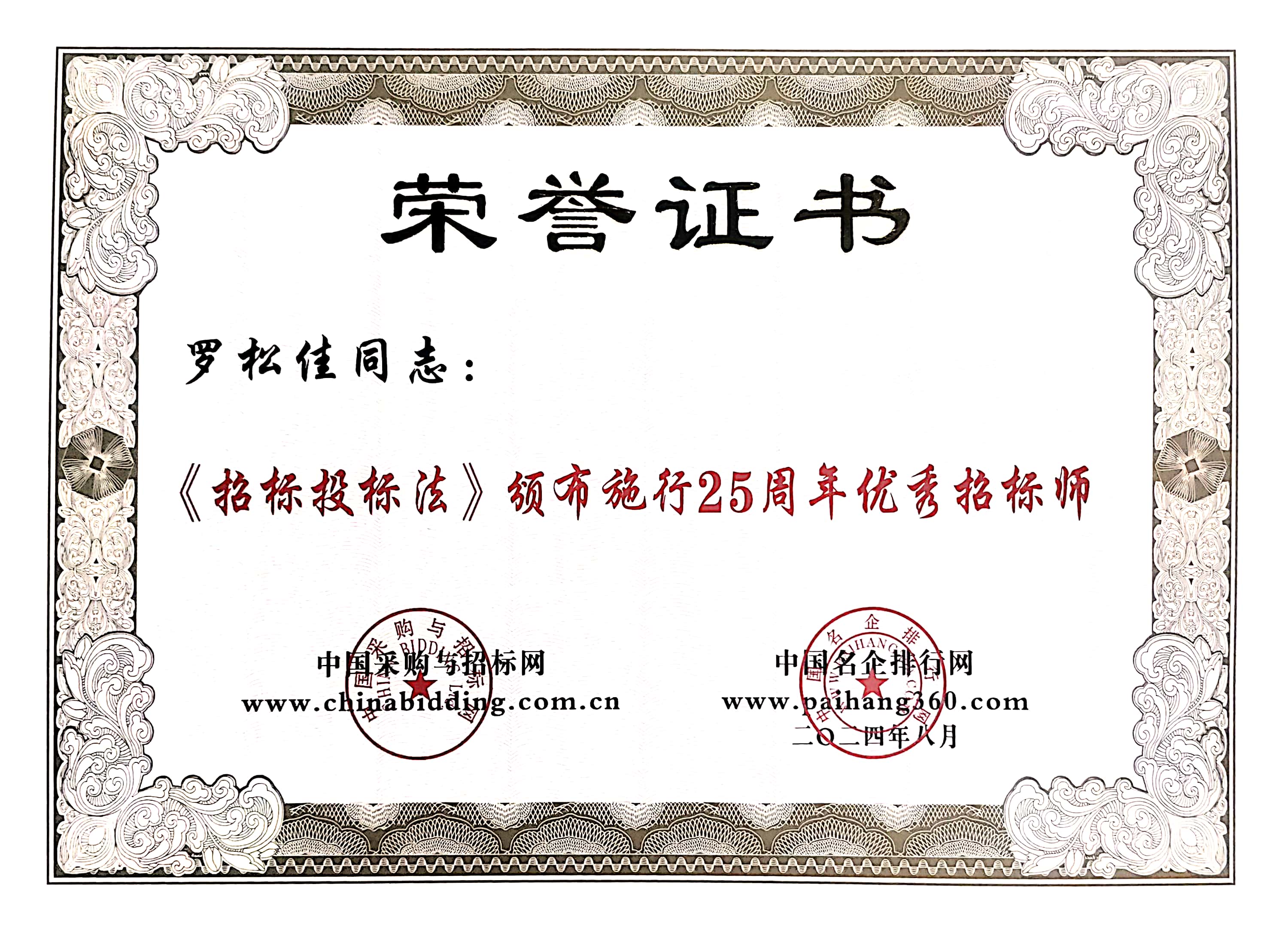 近日,穗科建管分别荣获中国采购与招标网、中国名企排行网联合颁发的“2024政府采购项目招标代理机构30强”、“2024百佳诚信招标代理机构”、“2024招标代理行业综合实力百强”荣誉证书。陈光远、曾冠、陈嘉欣、张增悦获评“《招标投标法》颁布施行25周年招标代理行业优秀职业经理人”荣誉称号;缑旭、陈光远、曾冠、罗松佳、何细峰、缑晓倩获评“《招标投标法》颁布施行25周年优秀招标师”荣誉称号。