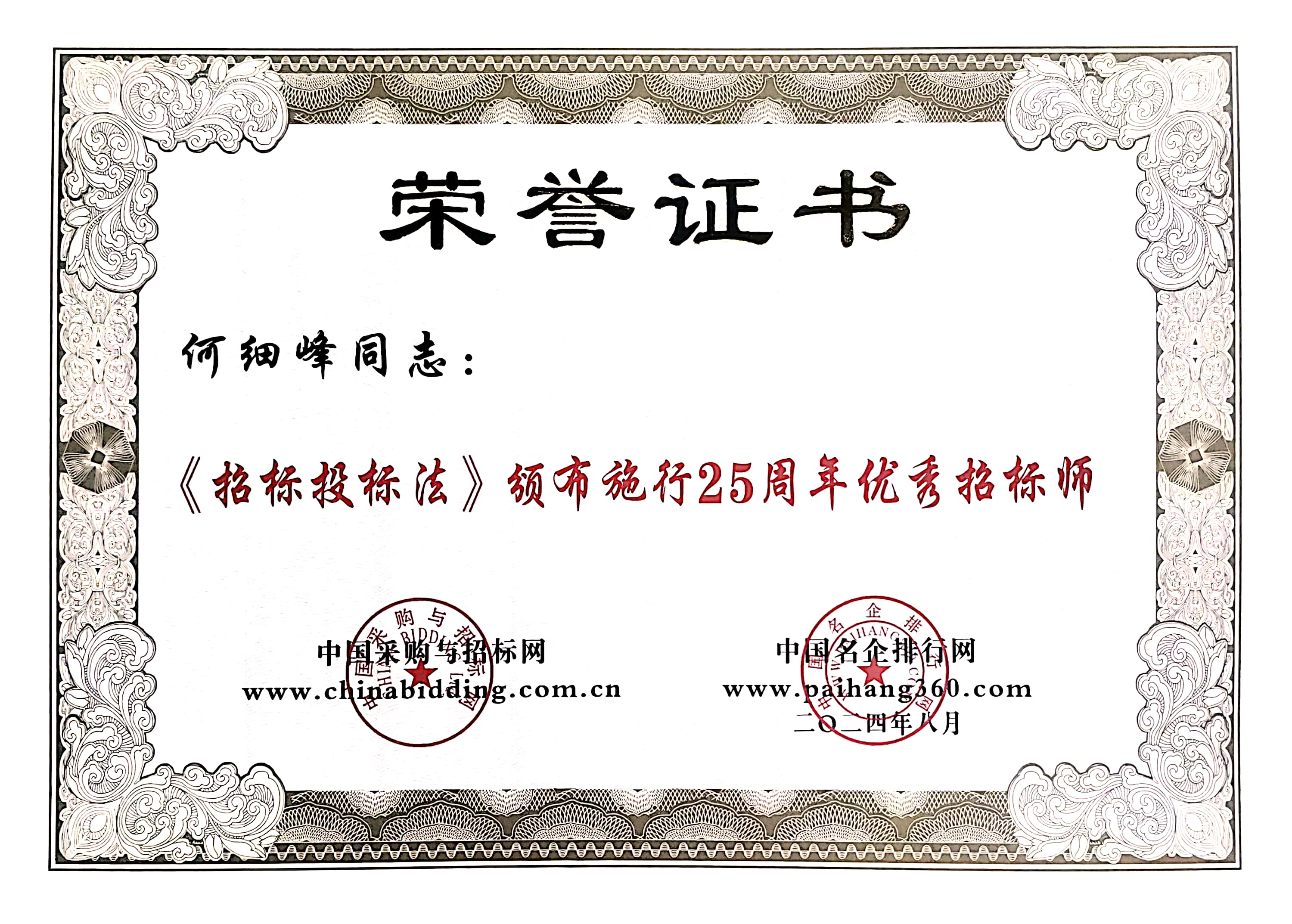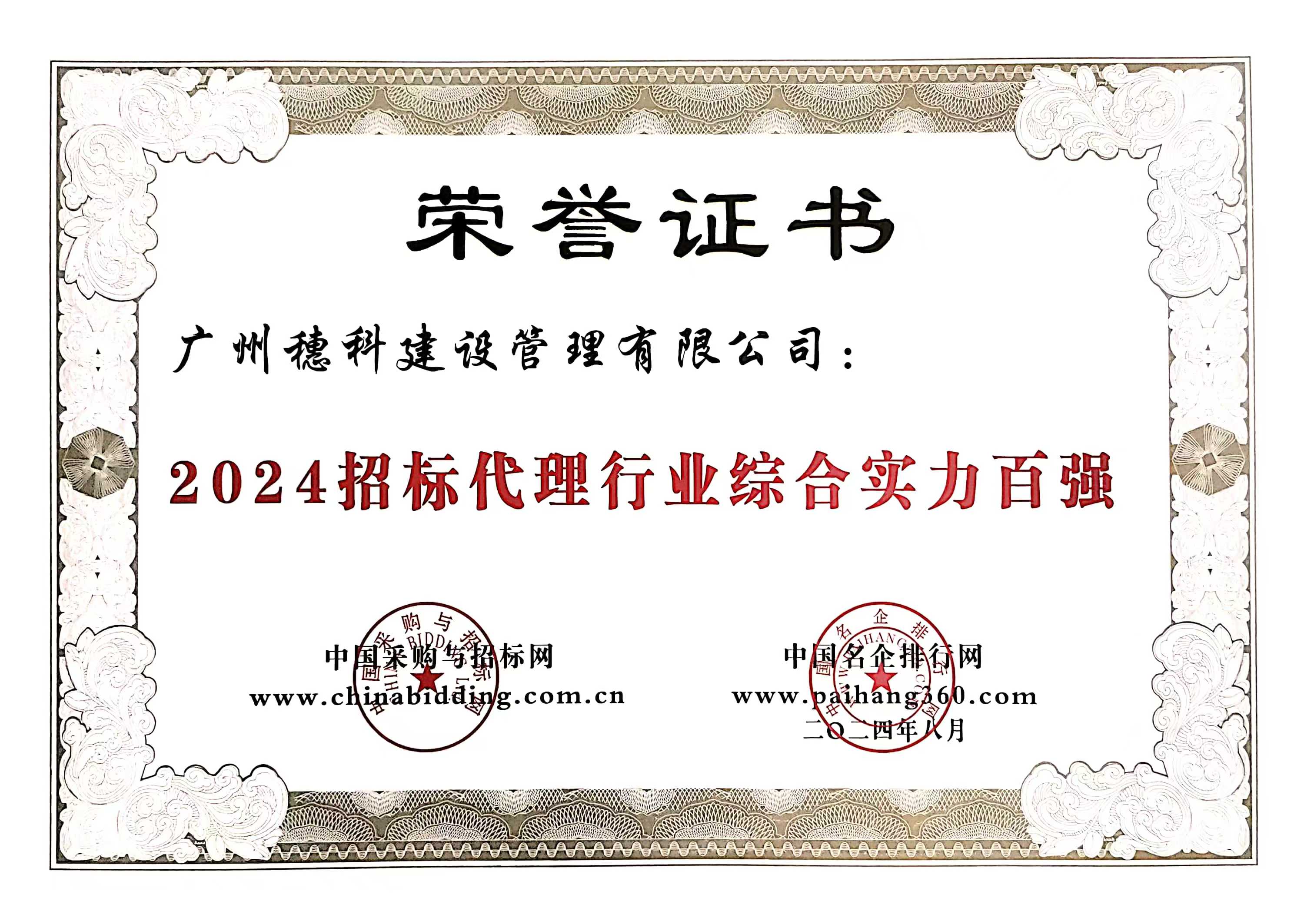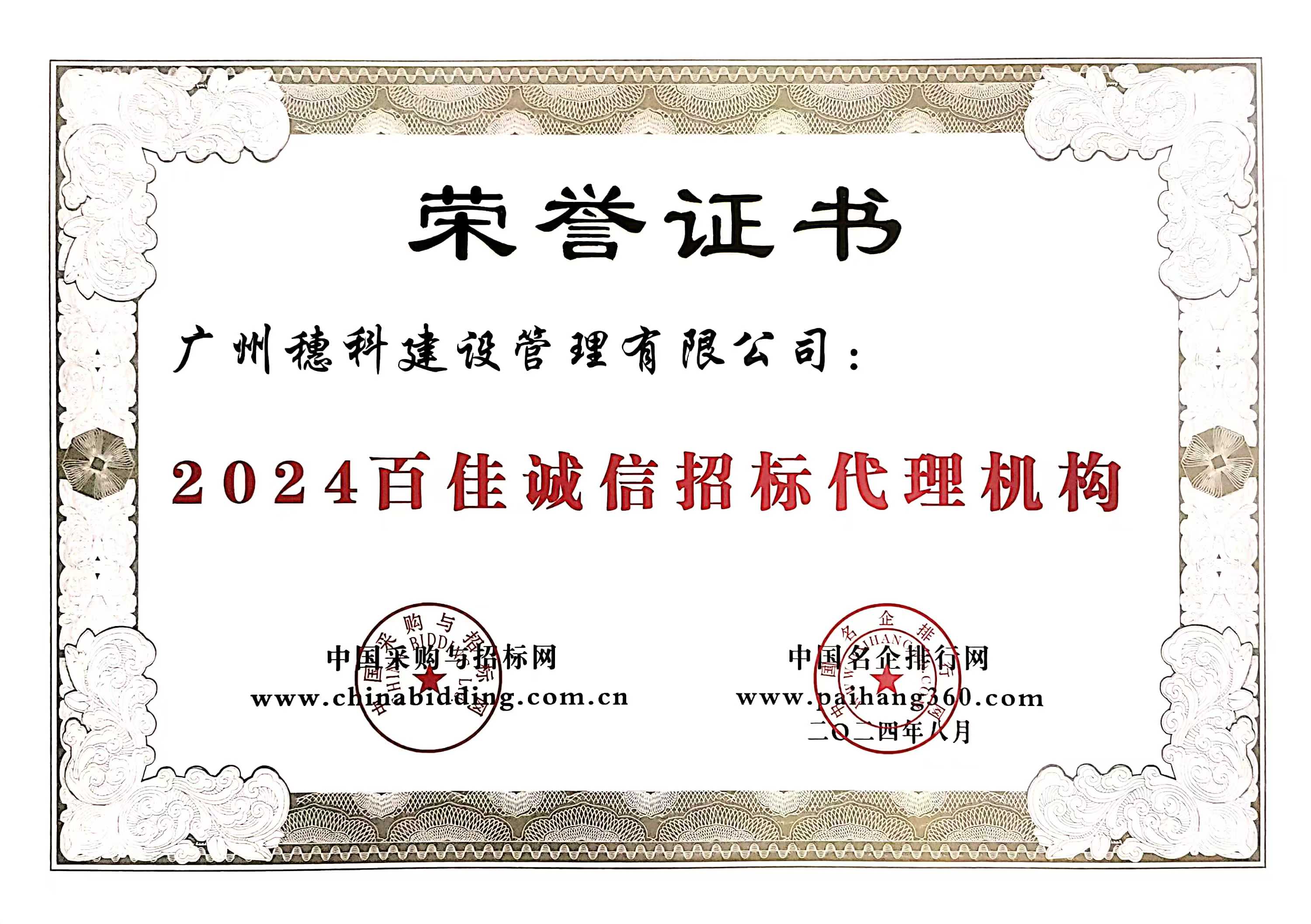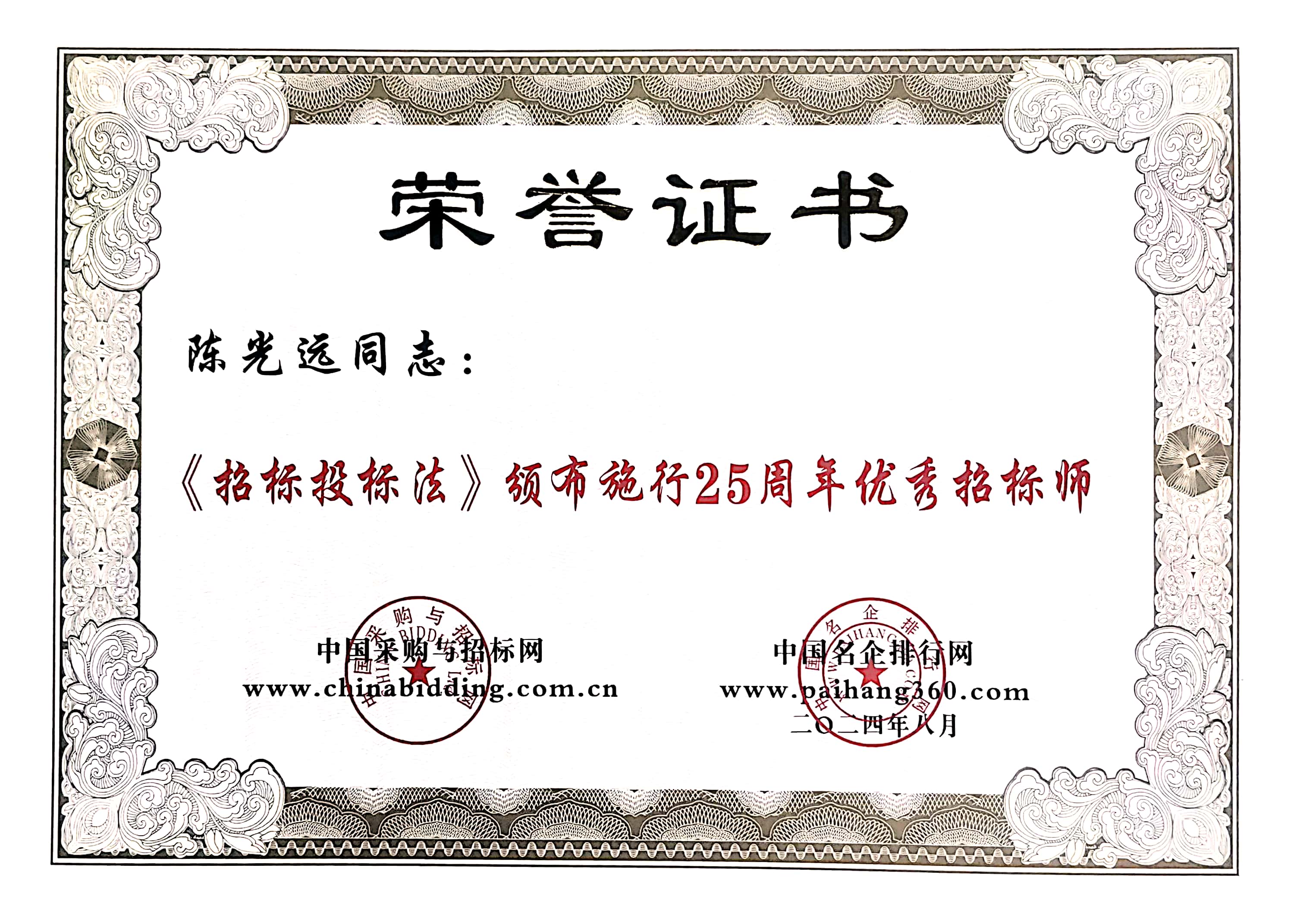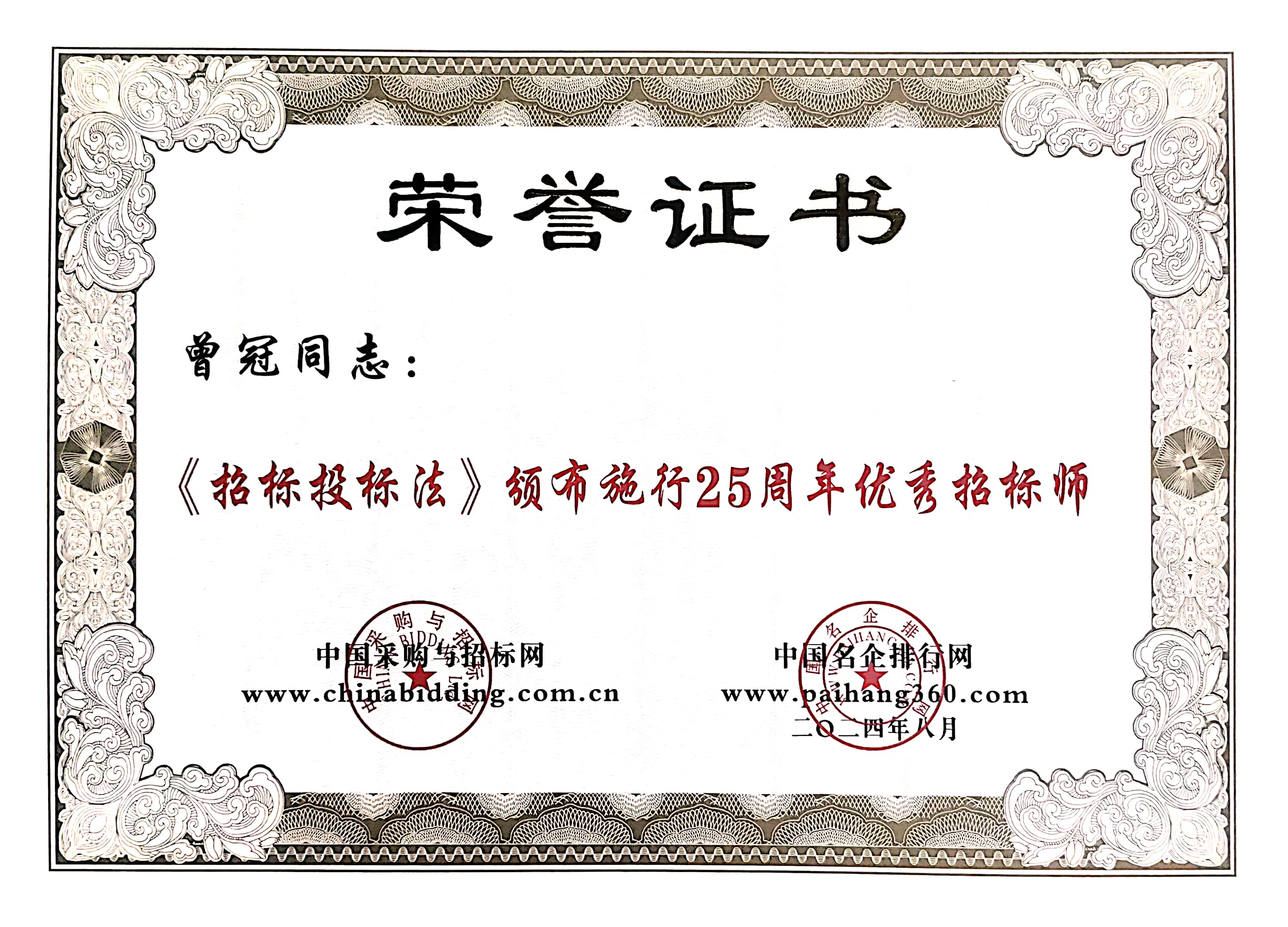 近日,穗科建管分别荣获中国采购与招标网、中国名企排行网联合颁发的“2024政府采购项目招标代理机构30强”、“2024百佳诚信招标代理机构”、“2024招标代理行业综合实力百强”荣誉证书。陈光远、曾冠、陈嘉欣、张增悦获评“《招标投标法》颁布施行25周年招标代理行业优秀职业经理人”荣誉称号;缑旭、陈光远、曾冠、罗松佳、何细峰、缑晓倩获评“《招标投标法》颁布施行25周年优秀招标师”荣誉称号。