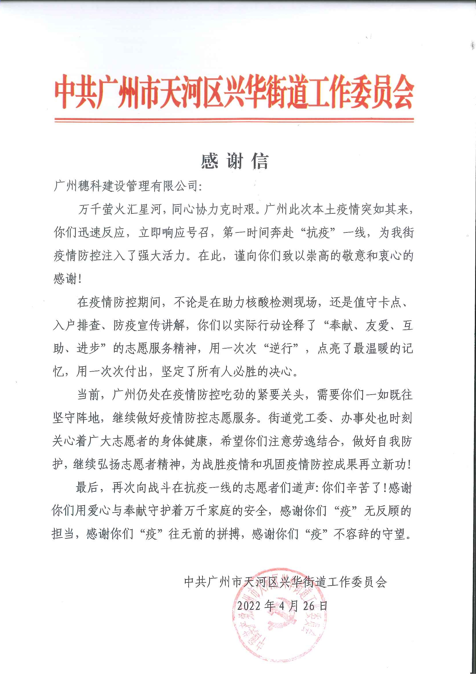 近日,公司收到中共广州市天河区兴华街道工作委员会送来的感谢信,来信对公司党支部组织参加疫情防控志愿者工作表示了充分肯定。